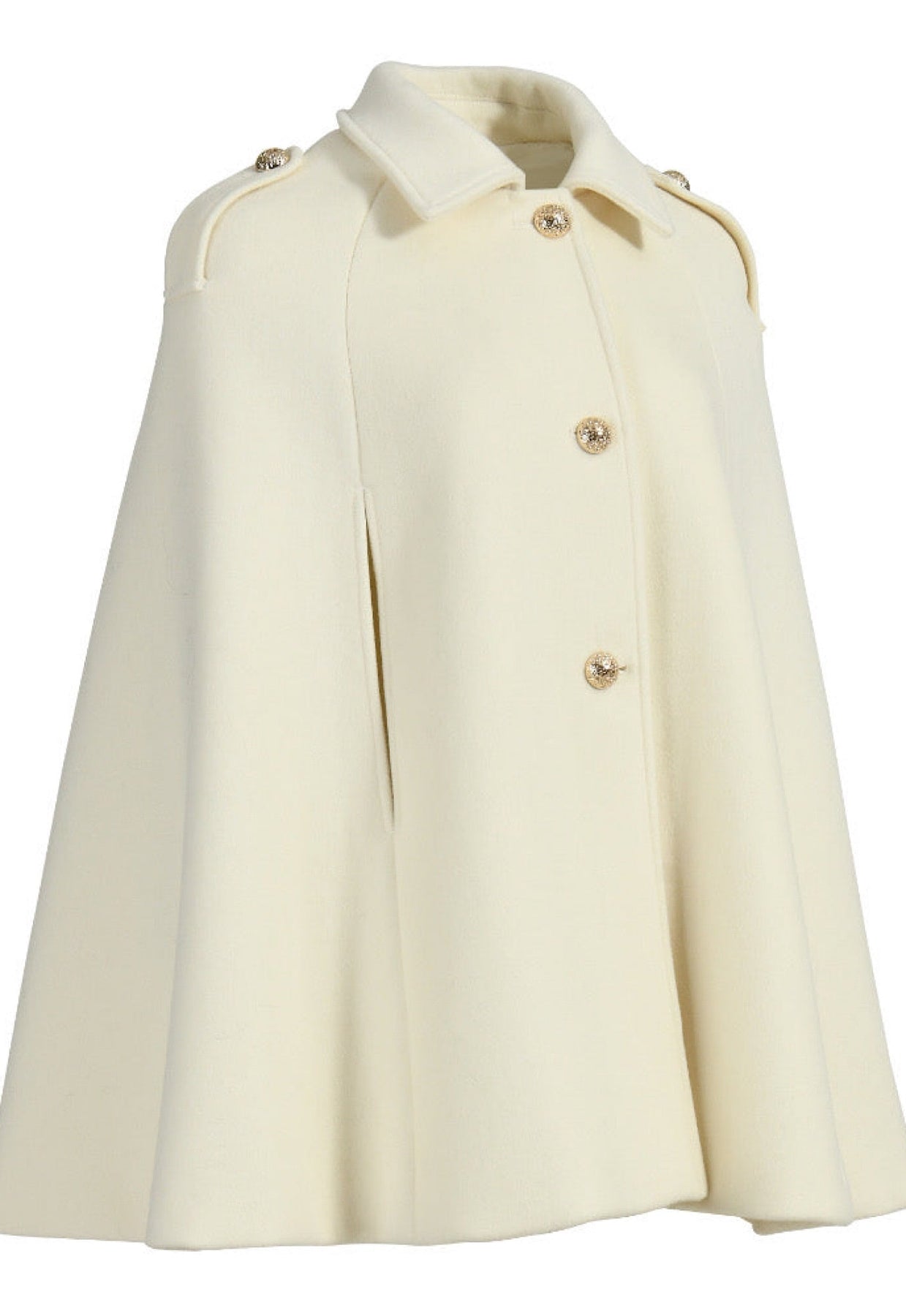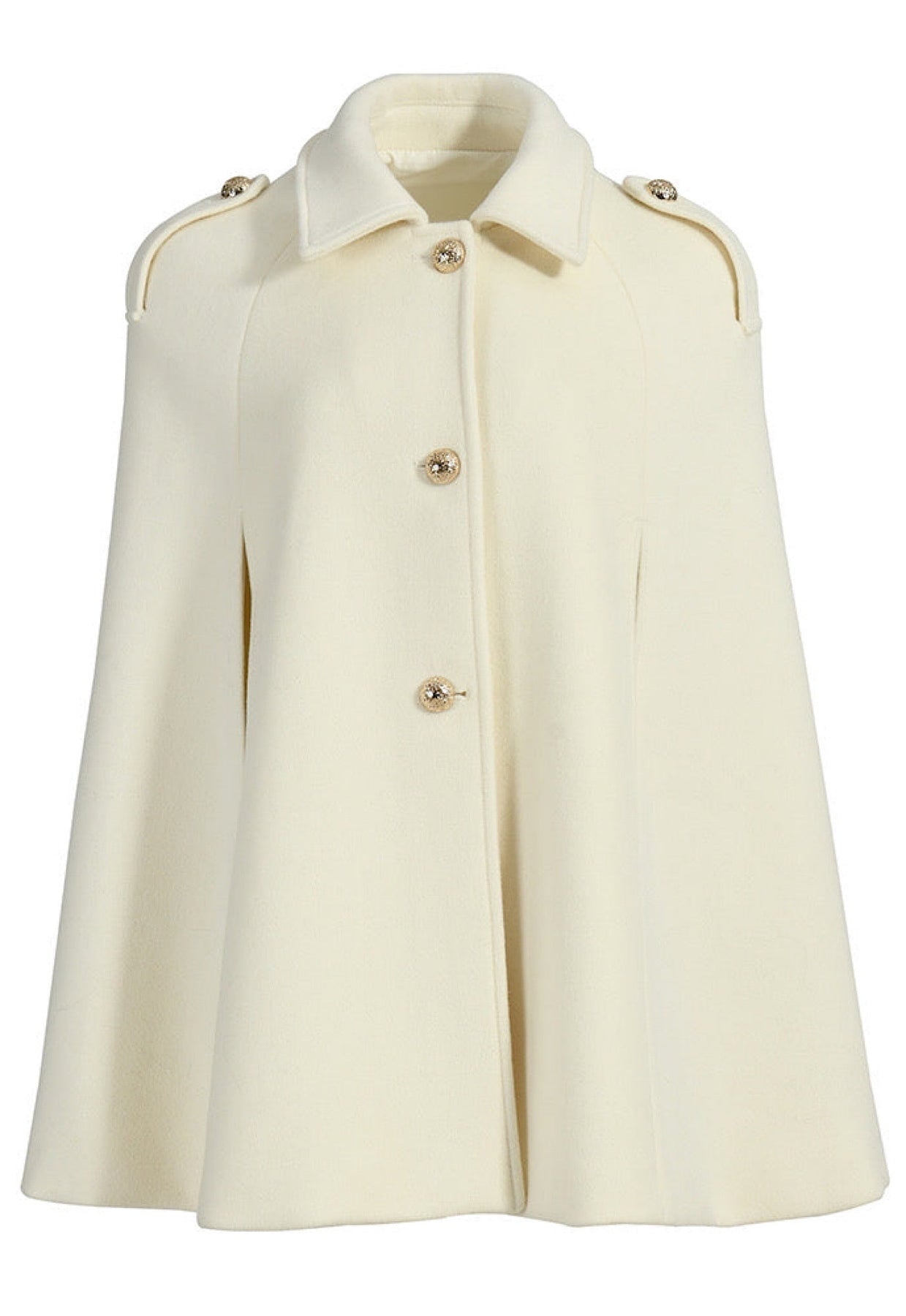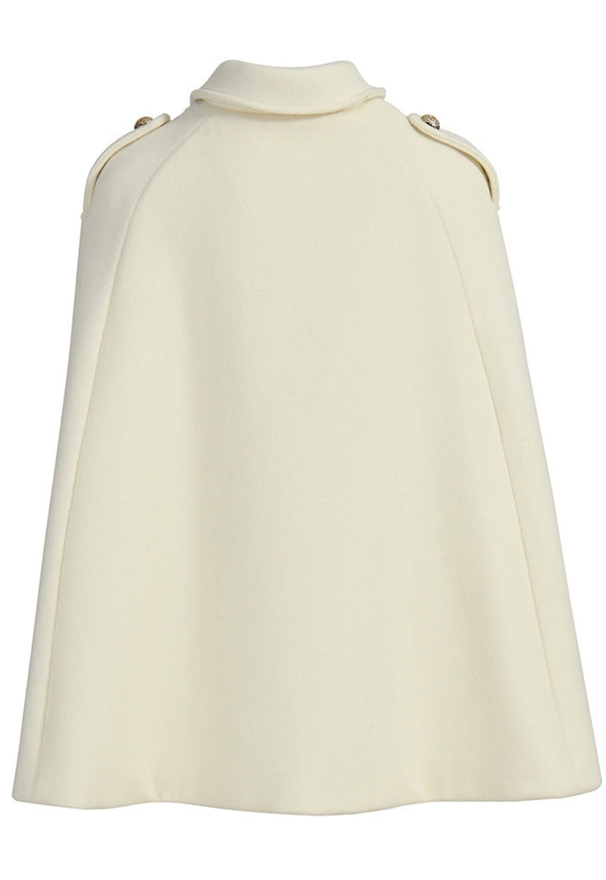 Elegant off white cashmere cape with gold buttons, featuring structured shoulders and a smart collar, bestseller this winter.
