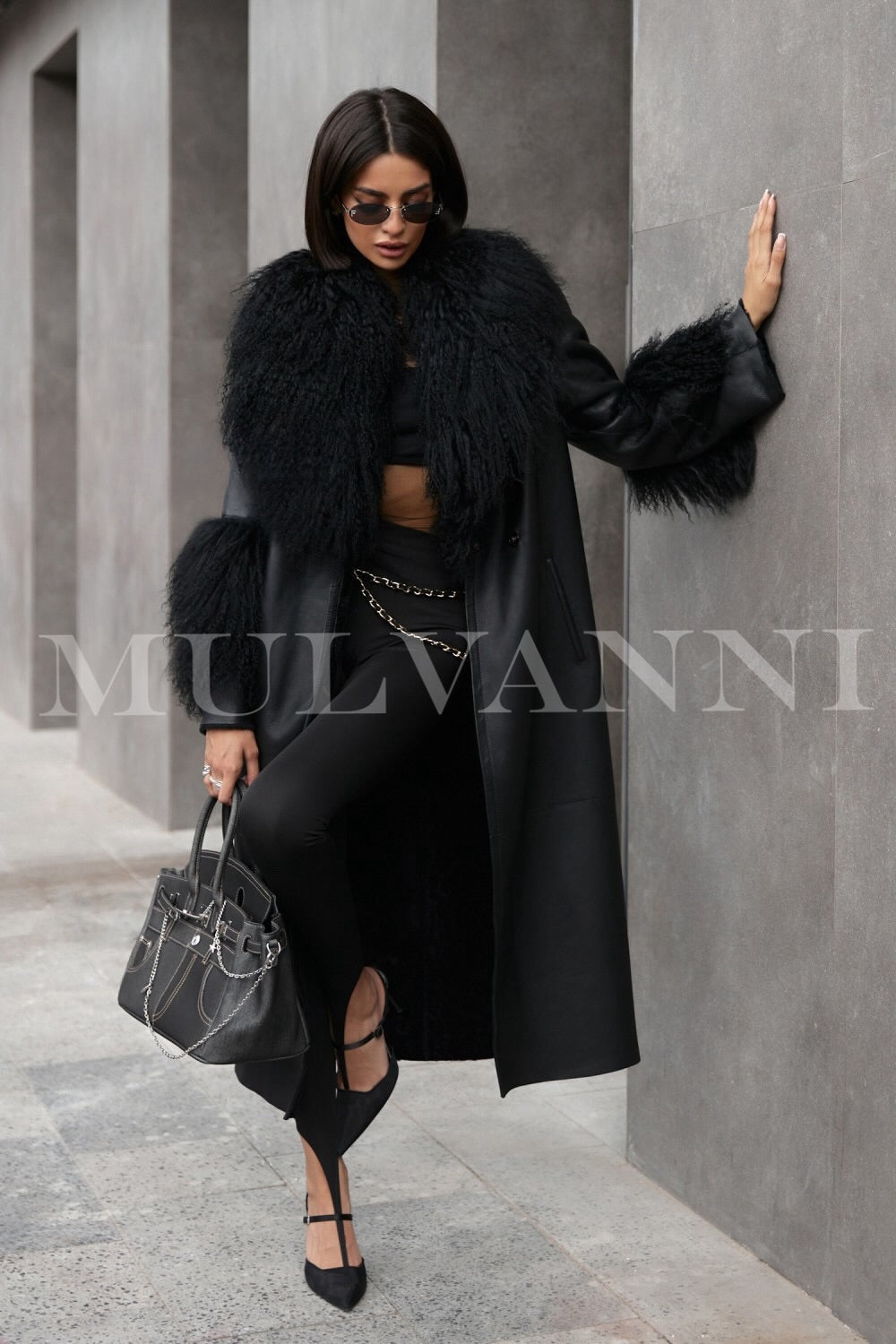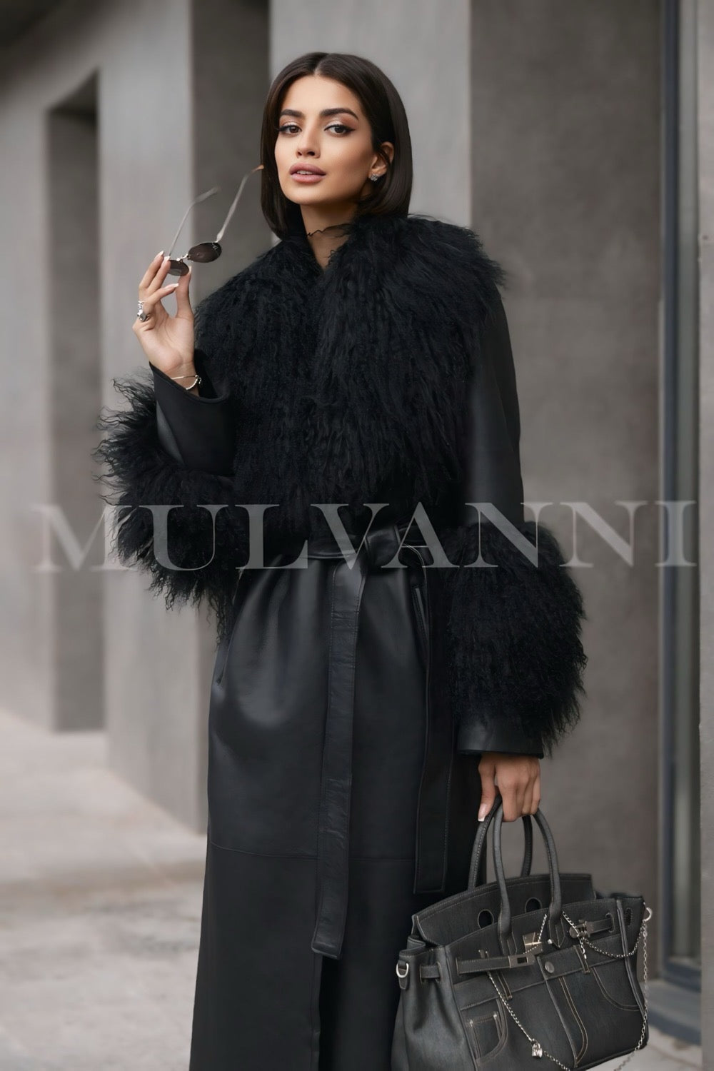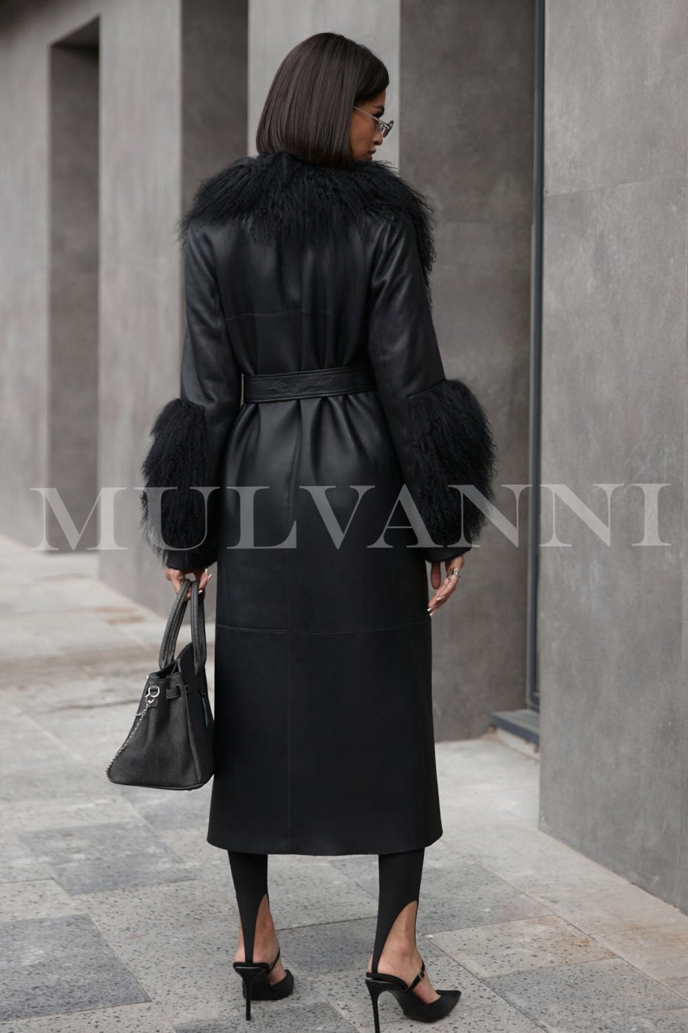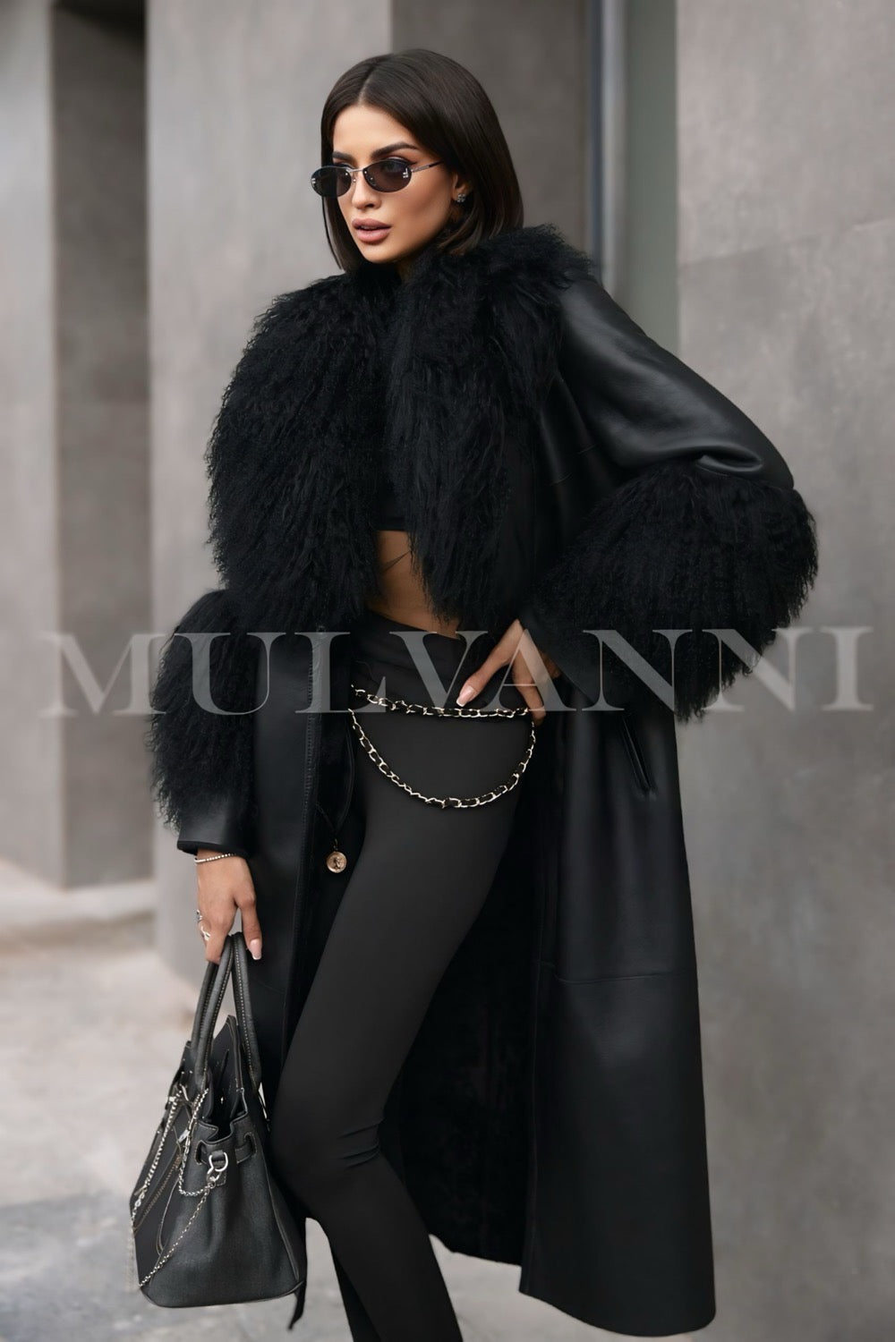 Make a statement with this sleek black Leather Trench Coat, accented by voluminous Genuine Mongolian Fur collar and cuffs. Crafted from smooth, high-quality genuine leather, it offers a flattering longline fit and luxurious texture.