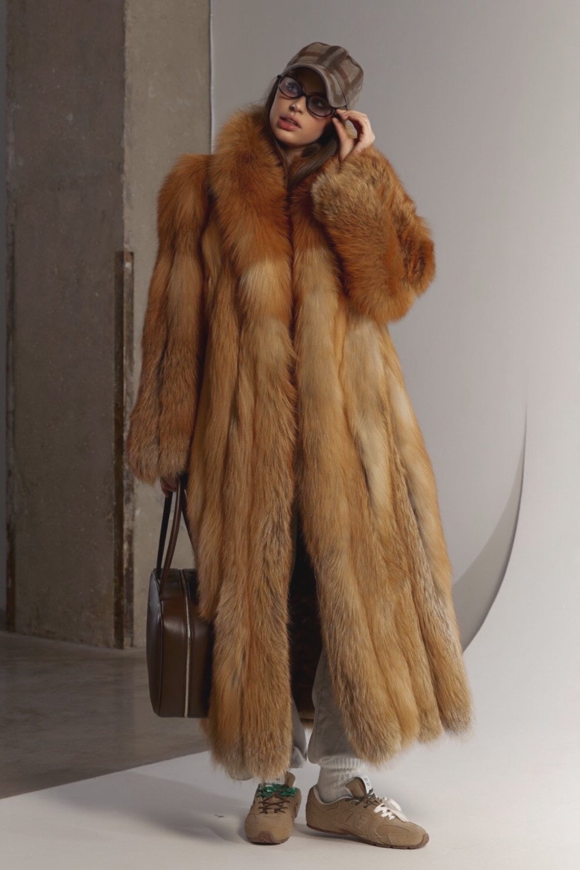 Chic and active, the woman’s red fox fur coat delivers exceptional warmth and style, its dense fur and elongated design making it ideal for cold weather with flair.